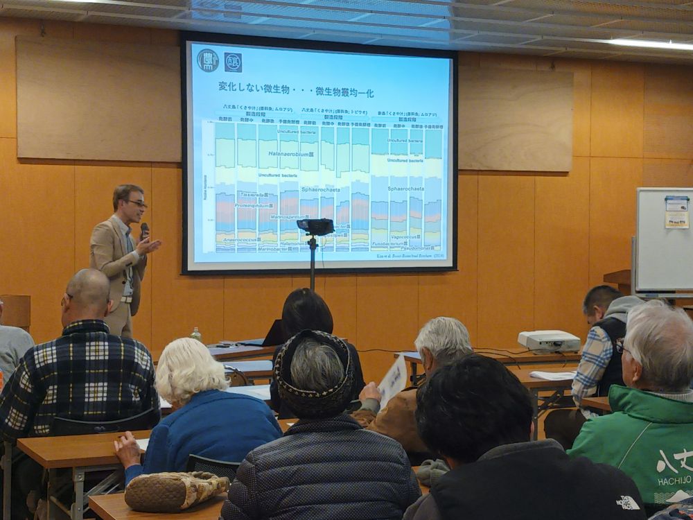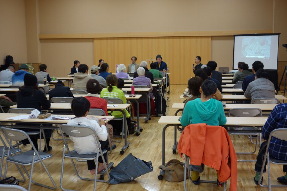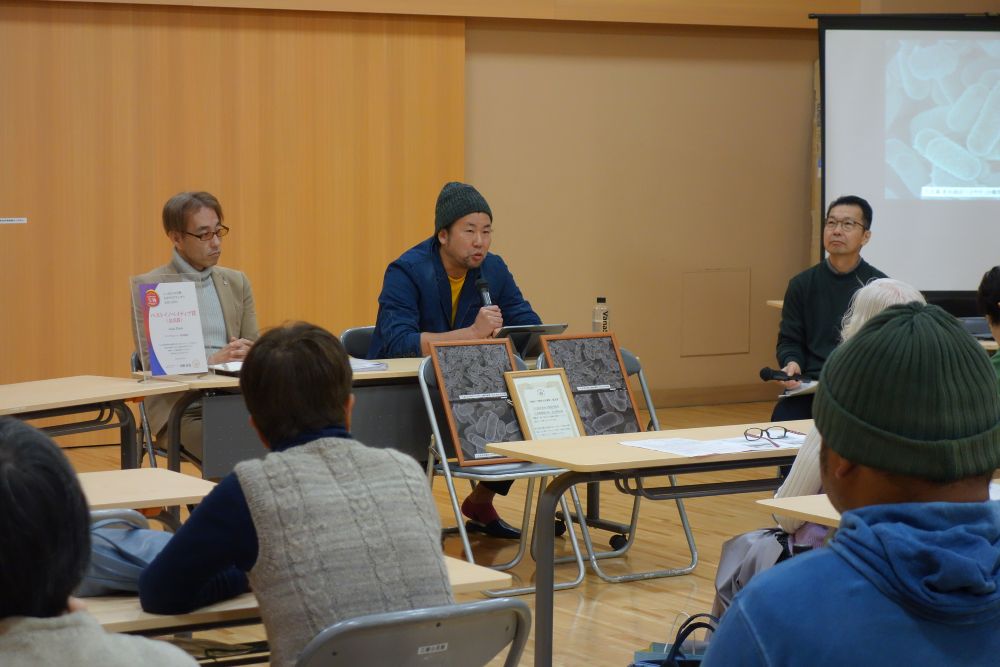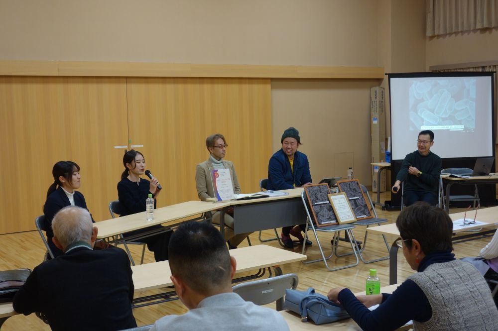 2日目は会場を三根公民館に移し、22日午後1時30分から行われました。前夜講演した鈴木敏弘先生に、東農大大学院の真崎祥子さん・大西美沙希さん、八丈島からチーズ職人の魚谷孝之さんとくさや製造に携わる長田隆弘さんが加わり、「伝統文化由来の乳酸菌と新しい乳製品の開発」をテーマにパネルディスカッションが行われました。