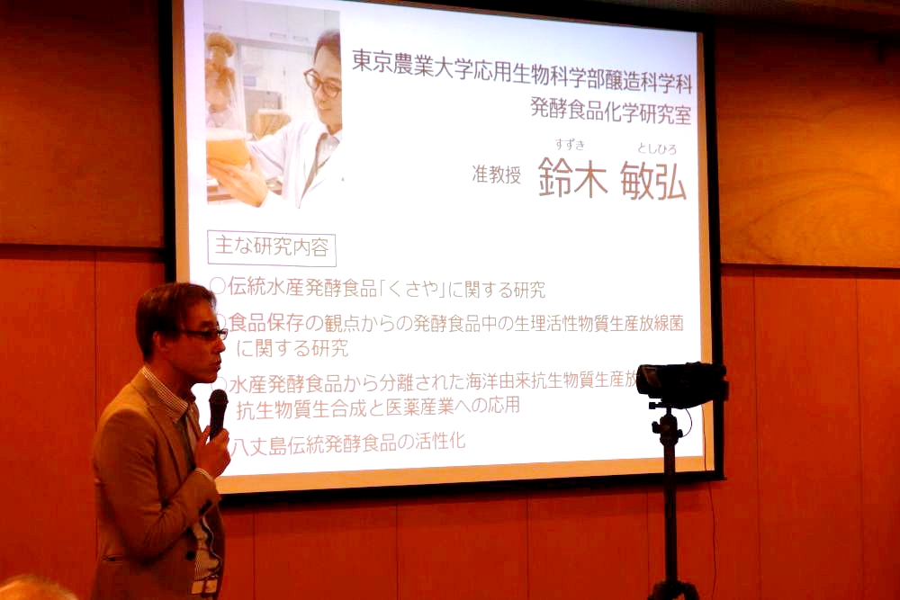 続いて、東京農大で醸造学を専攻、大学院で発酵食品化学を研究している真崎さんと大西さんは、「クサヤの美味しさを科学的に証明したい」、「クサヤ液に棲む微生物から新しい抗生物質のもとになる放線菌を分離したい」という強い思いから長田さんと出会ってクサヤ液の提供を受け、それをもとに根気強く研究を進めた経過を語りました。