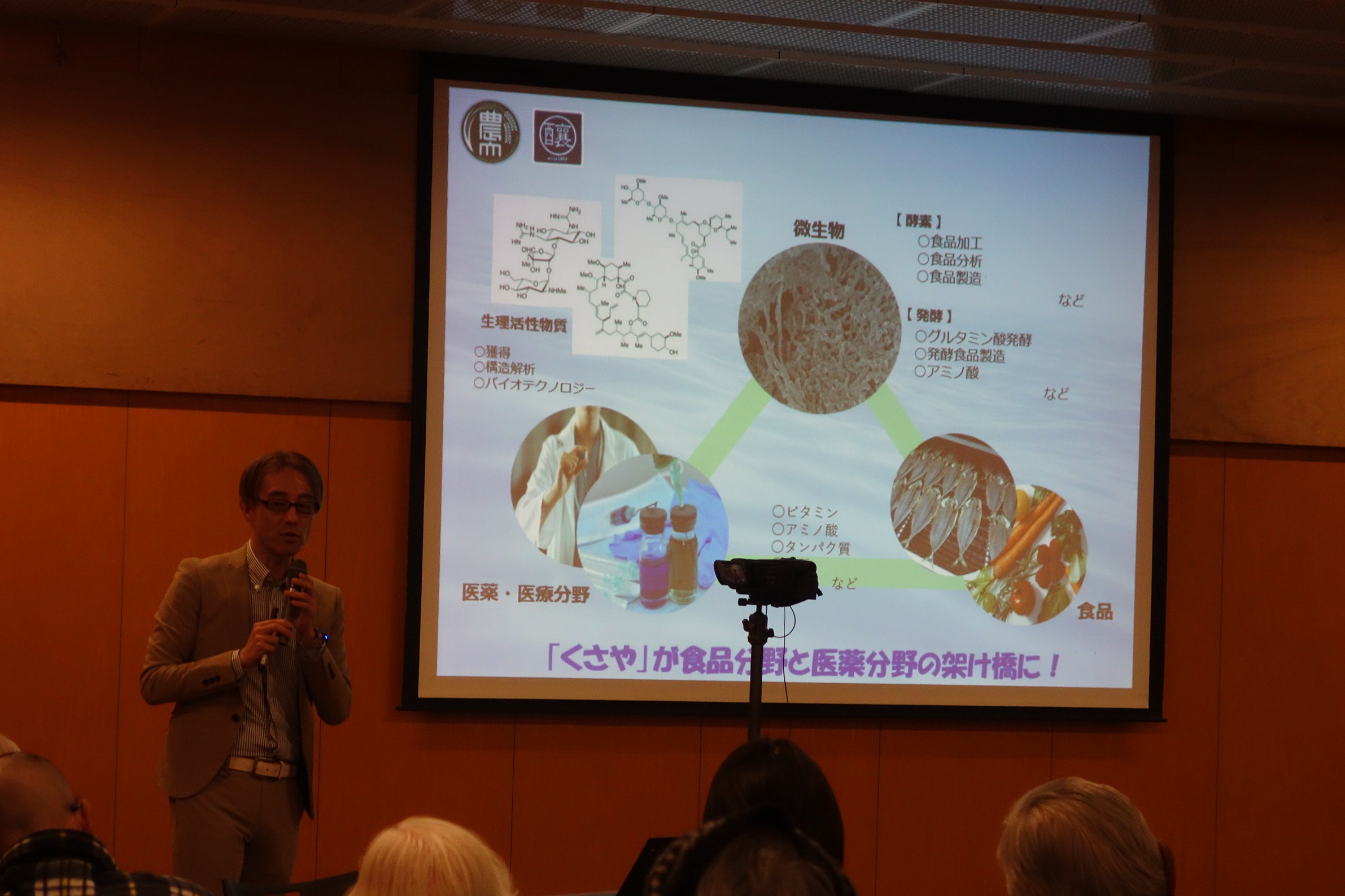 冒頭、2025年2月に、クサヤ液から分離した乳酸菌で作った「くさやヨーグルト」が独特の香りから解放された味わい豊かな飲み物として「にっぽんの宝物」の「進化と伝統部門」でグランプリを獲得、6月に大阪・関西万博で行われた世界大会で紹介された経過が映像で紹介されました。